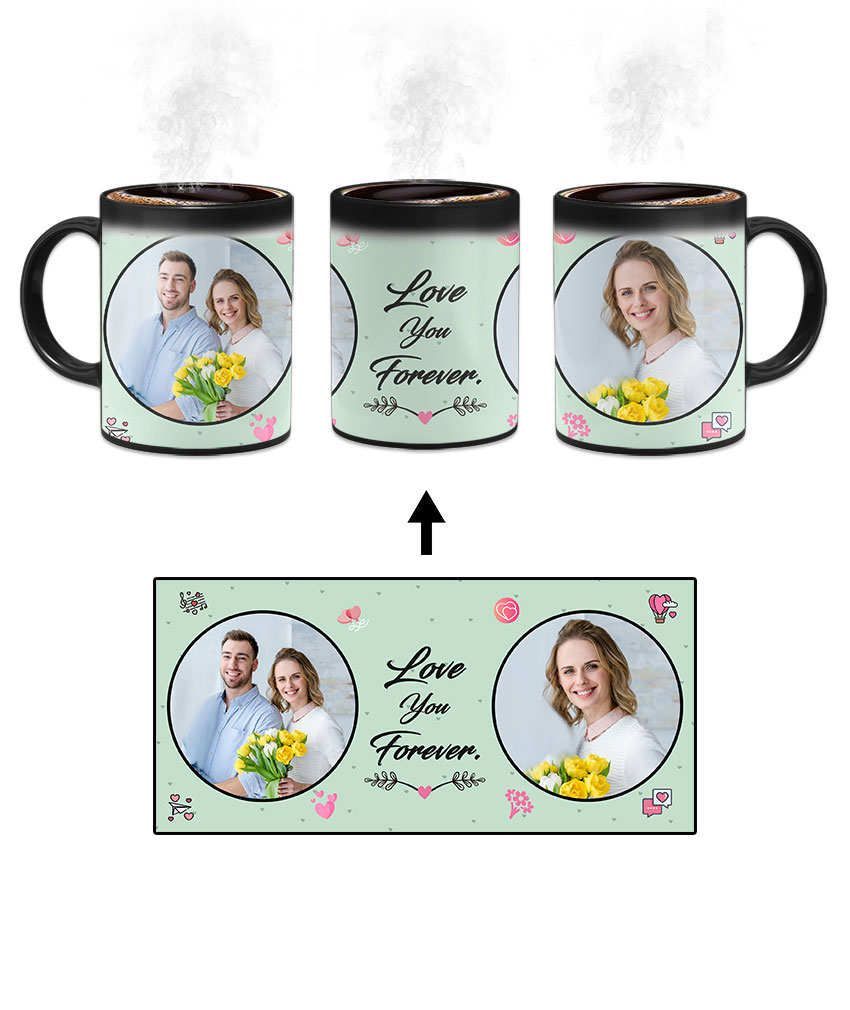 • Love You Forever Message With 2 Photos Yellow Background Custom Printed Magic Mug